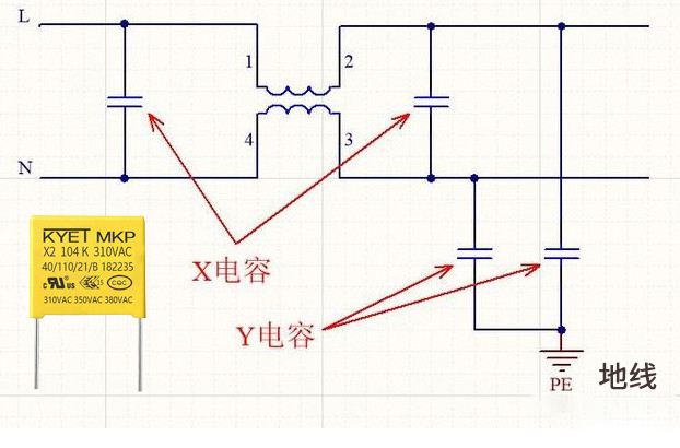 開關(guān)電源中的安規(guī)電容一般有X電容和Y電容,X電容是安裝在零線與火線之間,Y電容一般是安裝在地線與火線或地線與零線之間,具體的用法如下圖所示: