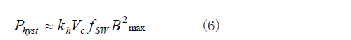 磁滯損耗與繞組的匝數和驅動方式有關。它決定了每個工作周期在B-H曲線內掃過的面積。掃過的面積就是磁場力所作的功,磁場力使磁心內的磁疇重新排列,掃過的面積越大,磁滯損耗就越大。該損耗由式(6)給出。