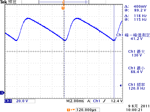 低頻紋波是與輸出電路的濾波電容容量相關。由于開關電源體積的限制,電解電容的容量不可能無限制地增加,導致輸出低頻紋波的殘留,該輸出紋波頻率隨整流電路方式的不同而不同。