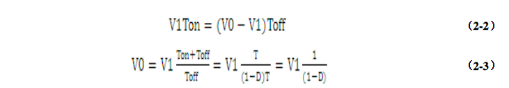 現在來講講開關電源的電路工作原理:Boost電路即升壓電路,當Q1導通時,能量從輸入電源流入儲存于電感L1中,此刻二極管D1反偏,負載由濾波電容C1供給能量,將C1中儲存的電能(C1V02/2)釋放給負載R1。當Q1截止時,電感L1中電流不能突變,此刻二極管D1導通,電感中儲存的能量(L1I2/2)經二極管D1,流入電容C1,并供給負載R1。依據電感的伏秒平衡,在一個周期內電感的伏秒乘積和為零。如果Q1導通時間Ton越大,那么Q1截止時提供給負載的電壓就會越大。下面通過具體的計算來加深了解:根據伏秒平衡有式(2-2)、(2-3)