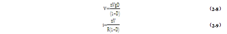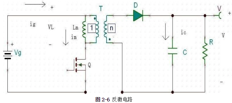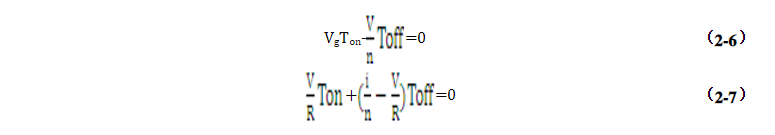現在來分析它的工作原理:當Q導通時,二極管截止,根據電路知識可知此時VL=Vg,ic=-V/R;當Q截止時,二極管D導通,VL=-V/n,ic=i/n-V/R。由伏秒平衡和電容充放電平衡可得: