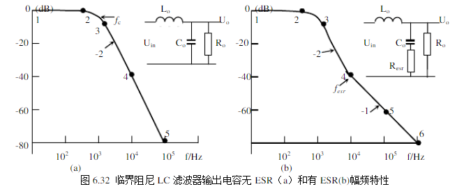 濾波電容有ESR的LC濾波器幅頻特性如圖6.35b的曲線123456。大多數(shù)濾波電容具有ESR。在f0以上的低頻段,容抗遠遠大于ESR,從Uo看到阻抗僅是容抗起主要效果,斜率仍為-40dB/dec;在更