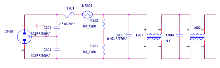 c901、C902為共模電容,首要按捺差模干擾,即前方和零線別離與地之間的干擾。電容值愈大對低頻干擾按捺作用愈好,在這里選用102PF/250V。