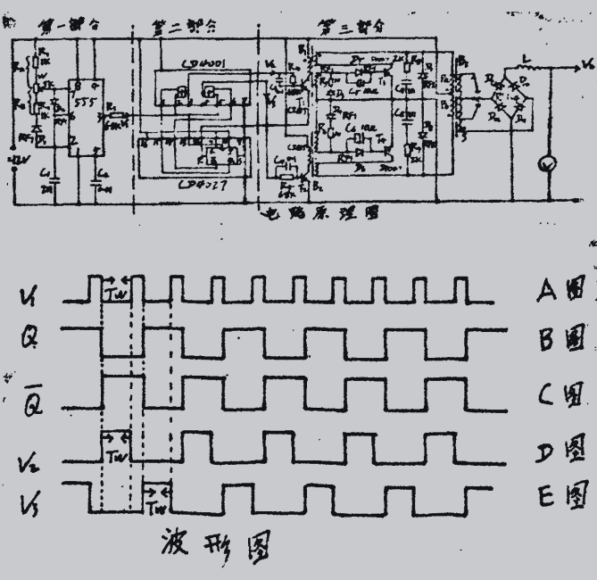 第二部分:這部分是由JK觸發(fā)器CD4027(只用一個(gè)y和四個(gè)輸入或非門CD4001(只用2個(gè))組成。這部分電路完成脈沖信號的邏輯關(guān)系。V作為K觸發(fā)器的時(shí)鐘信號。每當(dāng)時(shí)鐘信號的下降沿到來時(shí),JK觸發(fā)器的Q端和Q端電平都將發(fā)生反轉(zhuǎn),如圖B和圖C。因?yàn)榛蚍情T的2角和5角信號為V,1角信號為Q.6角信號為Q,我們知道或非門只有輸人端同時(shí)為低電平時(shí).輸出才為高電平。所以3角輸出波形V如圖D.4角輸出波形V,如圖E,它們的脈沖寬度為Tw。